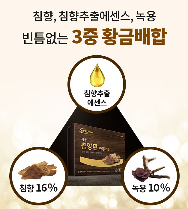 광동 침향환은 대표적인 침향환 브랜드로 세계 3대 향 중 하나인 '침향'과 최상위 SAT 등급을 받은 뉴질랜드산 '녹용'을 주요 성분으로 하여, 침향에센스와 14가지 국내산 전통 원료를 최적의 황금 비율로 배합한 제품입니다.